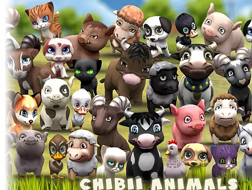 Chibii animals are low-poly 3D animated packs by 3DRT. 10 animals: a cow, a pony, a dog, a cat, a goat, a sheep, a pig, a puppy, a chicken, and a duck. Each animal has five different skin textures, for a total of 50 animals.