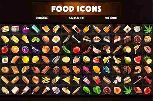 A set of 100 food-representing icons is ready to be used. They can be modified and used as you like.