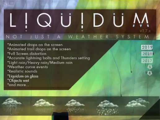 Liquidum Pro is a suite of professional real-time and dynamic liquid effects to simulate animated distortions on the screen, liquids over screen and objects, rain and thunder effects, wet and dry clothes and objects, weather events, and other liquid effects in the scene.