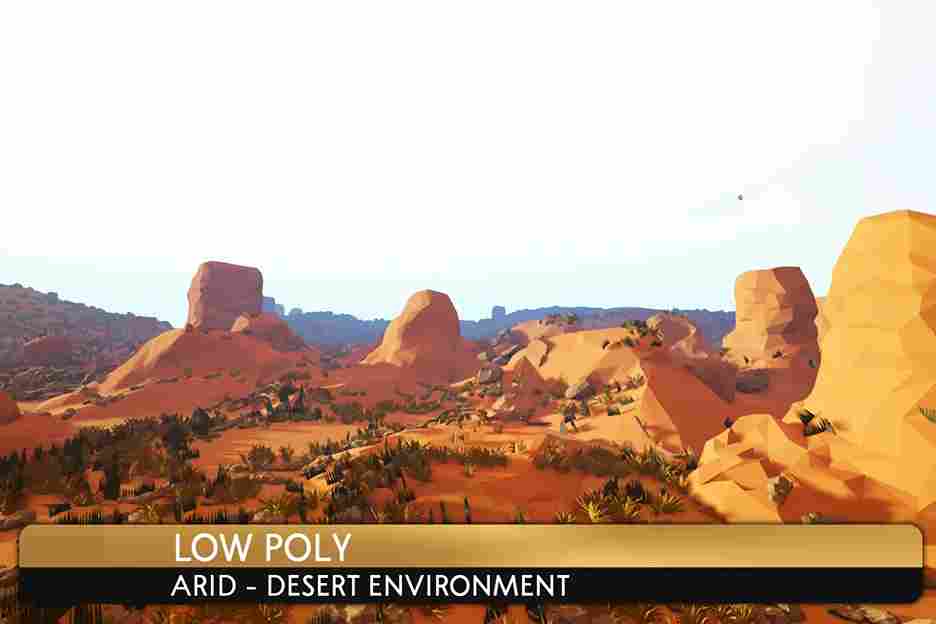 The pack contains dunes, rocks, pebbles, cliffs, cacti, trees, plants, grass, and bushes A sample and demo scene are included.