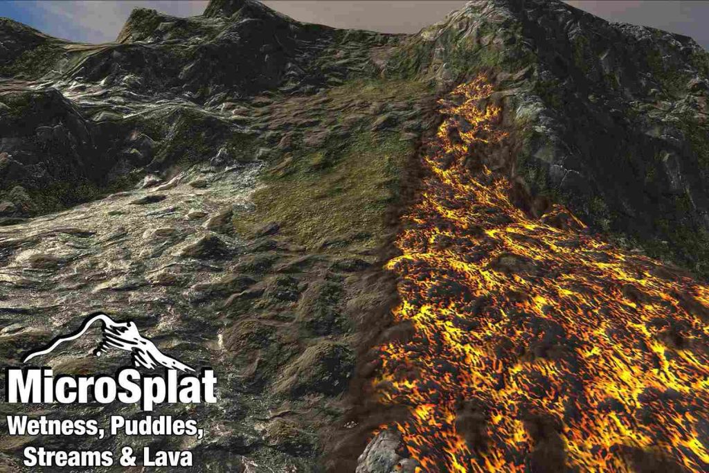 The Paintable Puddles, Streams, Lava, and Wetness module for MicroSplat adds support for paintable wetness, puddles, streams, and lava flows. A dynamic spawning system is also included, which allows water or lava to be poured over your terrain, flowing downhill.