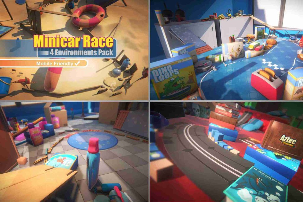 Minicar Race 4 Environments Pack contains all you need to create minicar race environments: walls, floors, furniture, and objects.