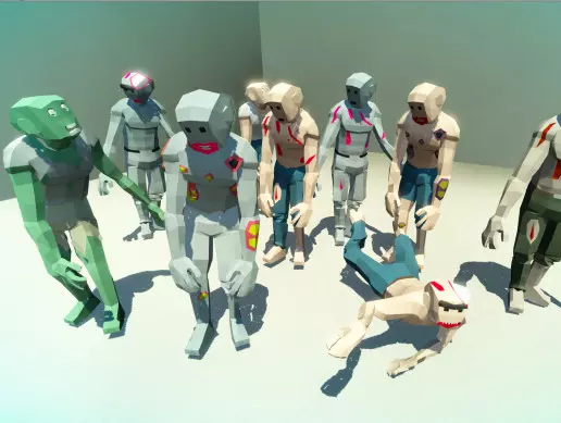 A pack of rigged zombies in low-poly style, which contains 4 base body types, 4 head types, and 4 texture types, makes 64 total variations.
