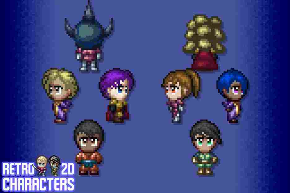 These characters are inspired by classic 16-bit RPGs and JRPGs. They feature 23 total animations, from walking to jumping, nodding, sword swinging, taking damage, carrying, and more!