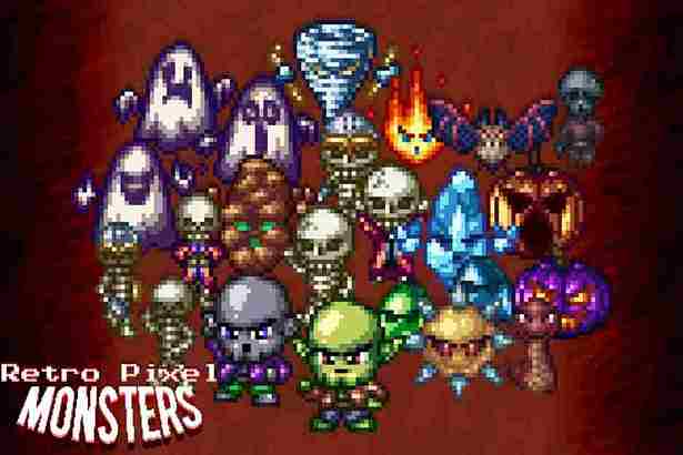 Retro Pixel Monsters features 16 different monsters with four directional animations. Two outline styles are available per monster, and some monsters have color variations. Use the included SpriteSkin script to switch outline styles and sprites!