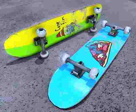 - Skateboards are fairly low poly, around 2500 polys for the detailed version and 1200 for LOD. All parts are modeled using reference pictures and blueprints. The wheels are separated, so they can be animated or removed.