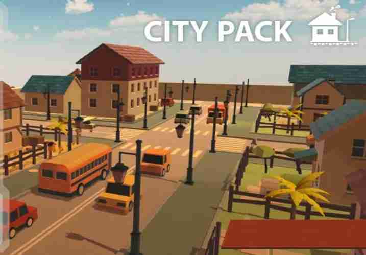 A pack of stylized buildings, trees, bushes, cars, military vehicles, planes (including military), characters (with animations), and props.