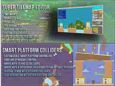 Super Platformer Editor is a pack that includes Super Tilemap Editor and Smart Platform Colliders to produce platform games with the style of both tools. Contains a fresh brochure that integrates the two tools.