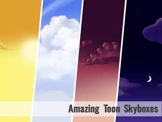 Toon skyboxes are perfect for any stylized background. Fill up the backdrop and add mood to your game with collection of 10 Skyboxes.