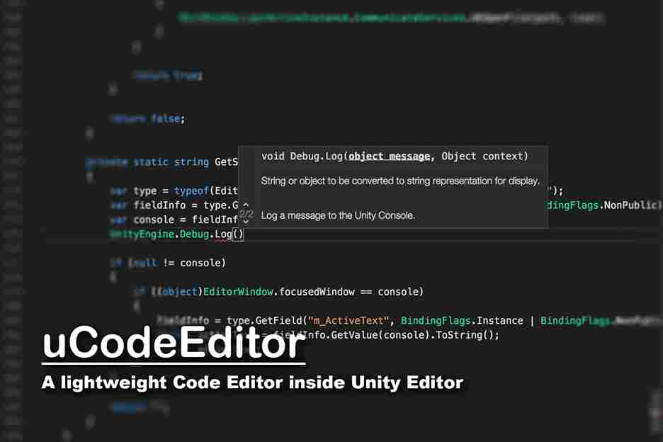 uCodeEditor is a lightweight code editor inside the Unity Editor. It supports C# and ShaderLab and has great editing features, including syntax highlighting, code completion, auto-formatting, etc. Because uCodeEditor is built on Monaco Editor, which is the code editor that powers Visual Studio Code, you may get similar coding experiences in uCodeEditor compared with VSCode.