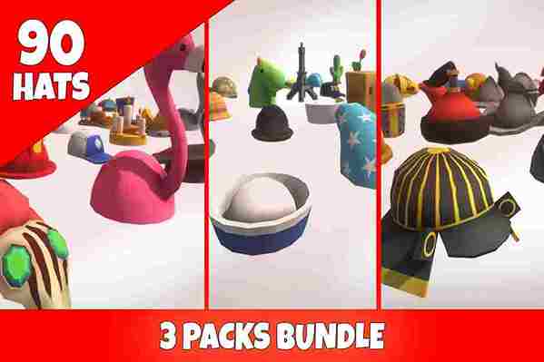 The ultimate collection of low-poly hats features 90 different models of hats in a cartoon-like style.